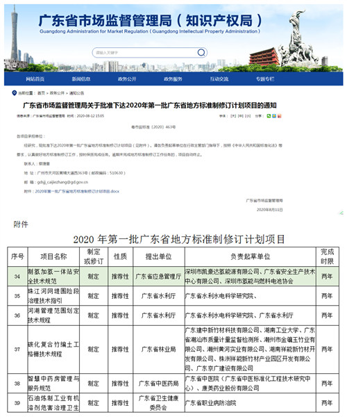 8月12日,廣東省市場監督管理局發布關于批準下達2020年第一批廣東省地方標準制修訂計劃項目的通知,公示了第一批廣東省地方標準制修訂計劃項目。其中,由深圳市凱豪達氫能源有限公司作為主導單位,廣東省安全生產技術中心有限公司、深圳市氫能與燃料電池協會作為參與單位聯合申報的《制氫加氫一體站安全技術規范》獲得正式立項,并將在行政主管部門指導下,按要求在兩年內完成制定任務,形成統一的制氫加氫一體站安全技術規范。