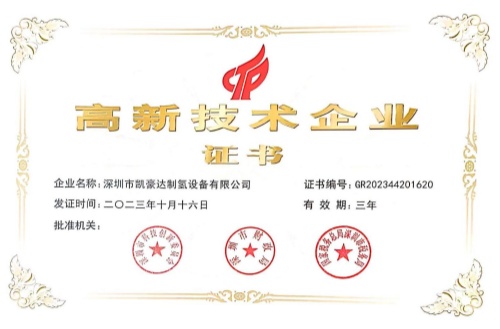 近日,深圳市凱豪達氫能源有限公司全資子公司——深圳市凱豪達制氫設備有限公司(以下簡稱“設備公司”)收到由深圳市科技創新委員會、深圳市財政局、國家稅務總局深圳市稅務局聯合頒發的《高新技術企業證書》,正式邁入國家高新技術企業行列,這代表設備公司的自主創新能力、科技成果轉化能力、自主知識產權、企業成長性等多個指標在業內處于領先地位。